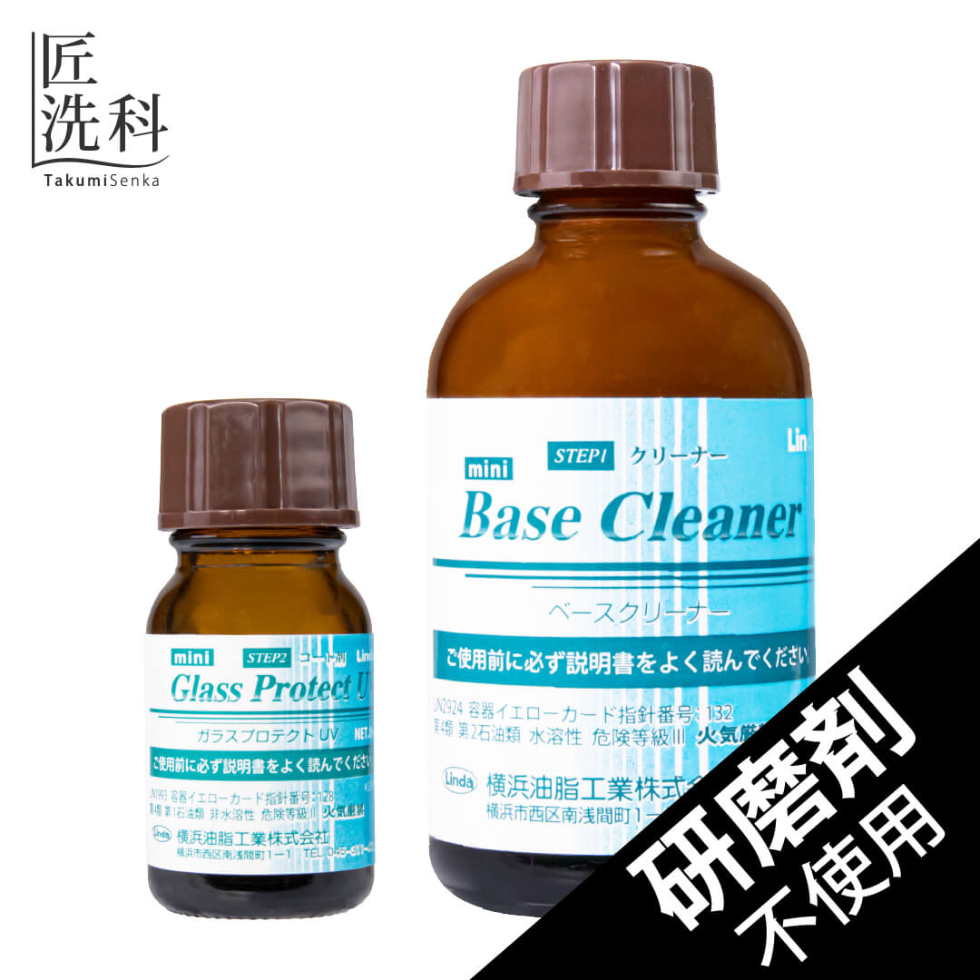 ベースクリーナーで表面の汚れを浮かせて落とし、ガラスプロテクトで光沢復活!